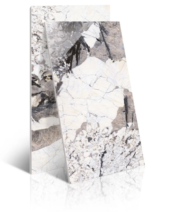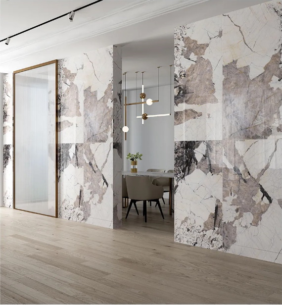 珍稀纹理的暮雪兰带来了富有冲击力的视觉观感,用于背景墙上延绵的肌理看起来就像一幅完整的泼墨画,把大自然的壮阔美景搬进家,为家定下了舒缓、宁静的主调,很好的诠释出了优雅轻奢的意味。